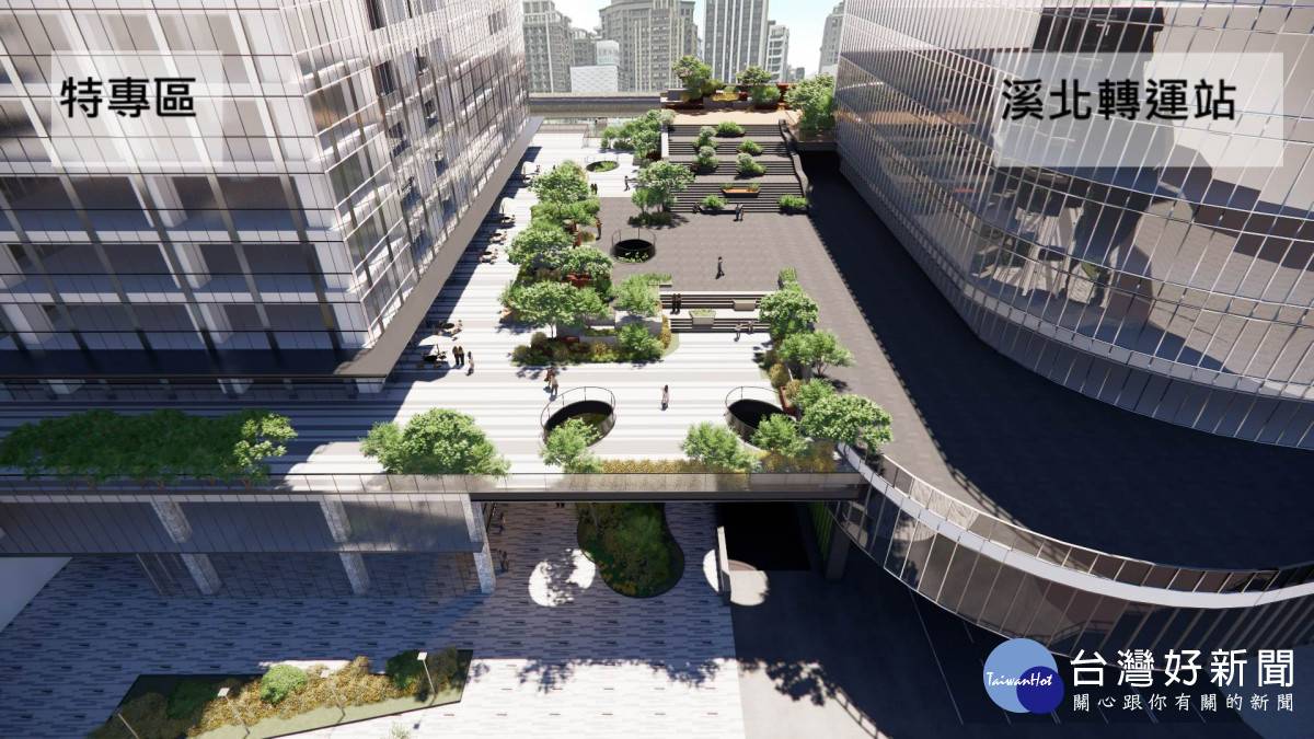 城鄉局長黃國峰表示,透過市府相關局處協調合作,運用3D策略(發展強度提升、混合使用、設計優化)及一日生活圈概念,訂定地面開放空間、空橋與空中廊道的立體連通原則,將溪北交通轉運站旁占地1.5公頃之41層大型商業辦公大樓,總樓地板面積逾23萬平方公尺,於商辦大樓3樓設置大型空中平台連結溪北交通轉運站,該平台採複層綠化規劃,有效串聯交通場站與商業空間,結合商業活動鼓勵使用大眾運輸,創造舒適、便捷之都市步行環境。