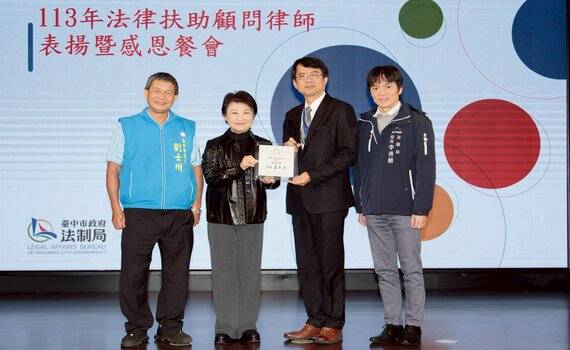 (觀傳媒中彰投新聞)【記者顏淑娟/台中報導】中市府法制局今(24)日舉辦「113年度法律扶助顧問律師表揚大會」,表揚為市民提供法律諮詢服務的182位法律扶助顧問律師及熱心參與公益的台中律師公會、法扶基金會台中分會、犯保協會台中分會。市長盧秀燕親臨頒發感謝狀及獎牌,感謝律師們長期以來以專業守護市民權益,並展現台中作為友善宜居城市的實力。