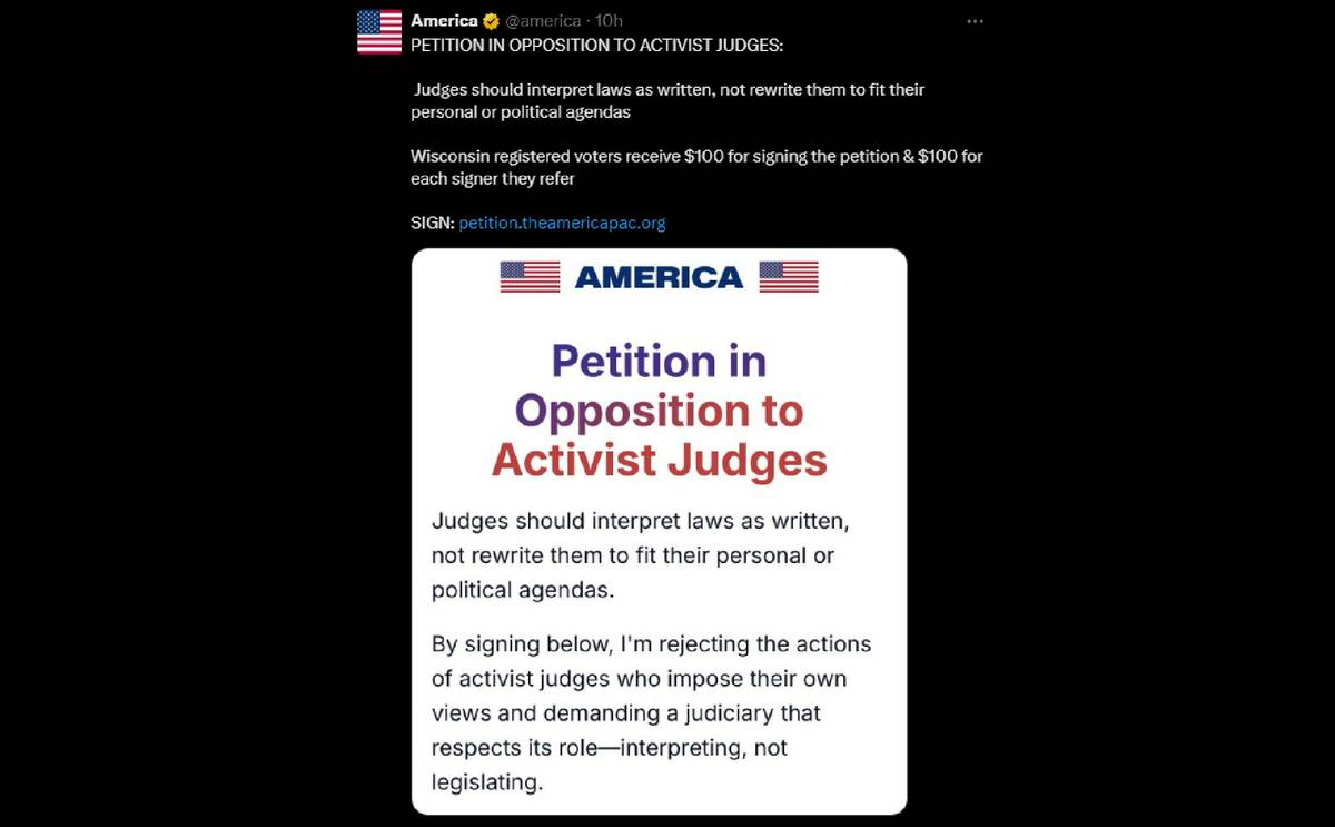 「美國政治行動委員會」(America PAC)於X平台表示,將發放100美元給簽署「彈劾激進法官請願書」的威斯康辛州選民。(擷取自X平台@america)