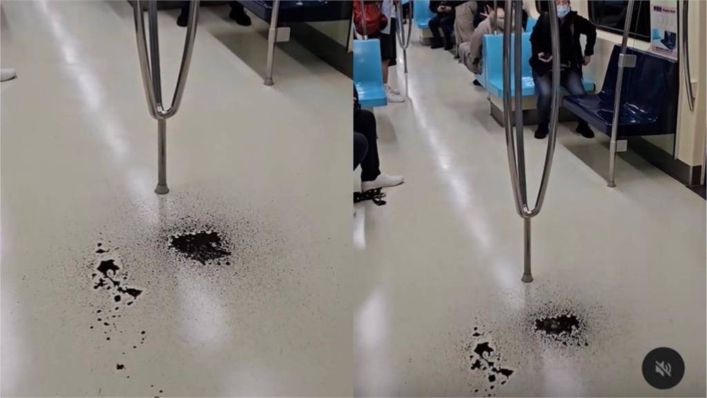 仔細看,這灘液體漆黑的有如墨汁一般,從中央扶手上方的天花板,沿著縫隙不停滴下,白色的車廂地板上也因此積了一大灘黑水。原PO說,他當時正搭乘搭往淡水方向的捷運,當列車行經紅樹林站時,就在車廂內看到有如電影《猛毒》中會出現的場面,讓他十分傻眼,趕緊拿出手機拍下影片。